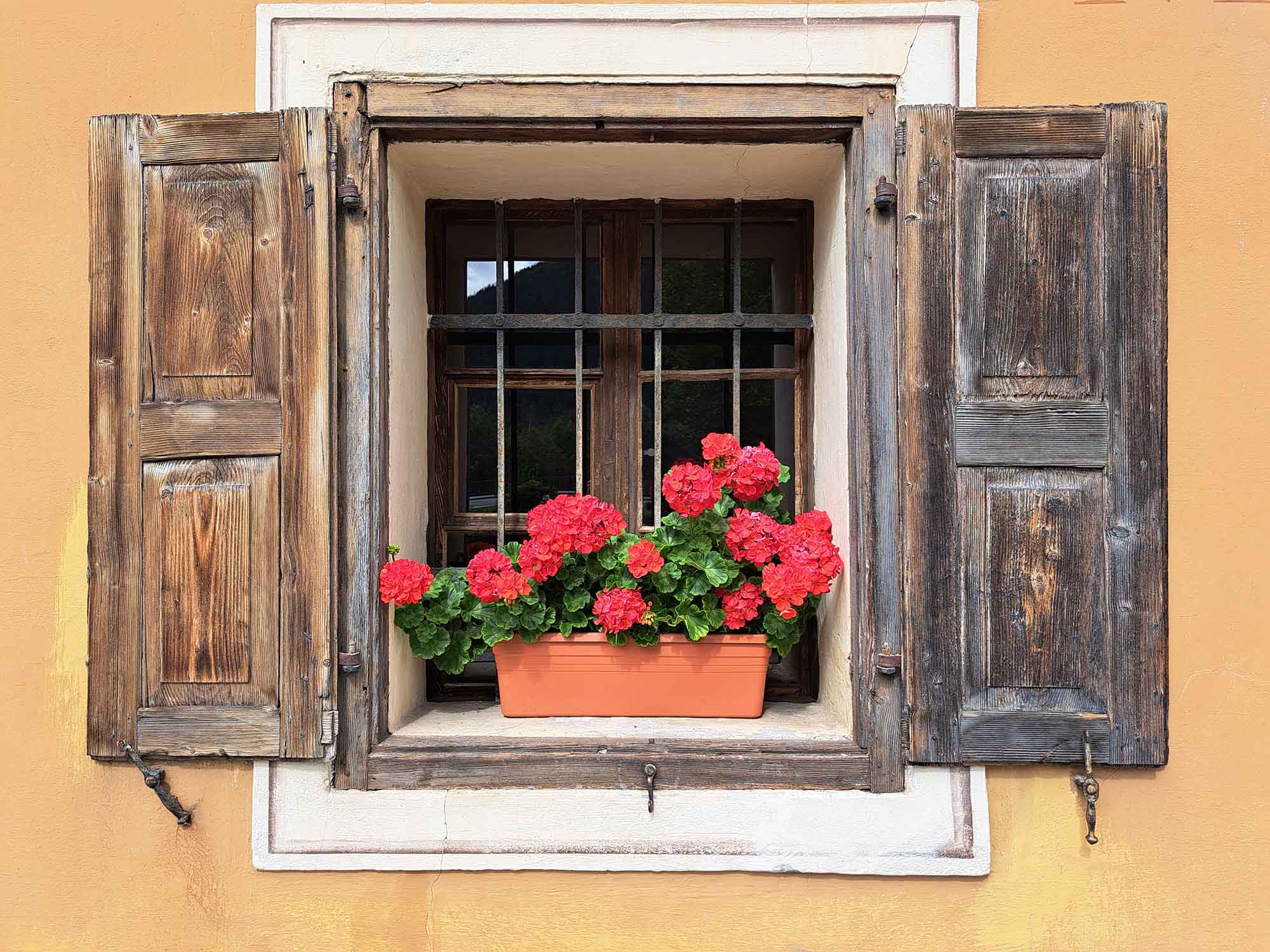 Een kleurrijke gevel met bloeiende geraniums straalt levendigheid, vreugde en expressie uit.