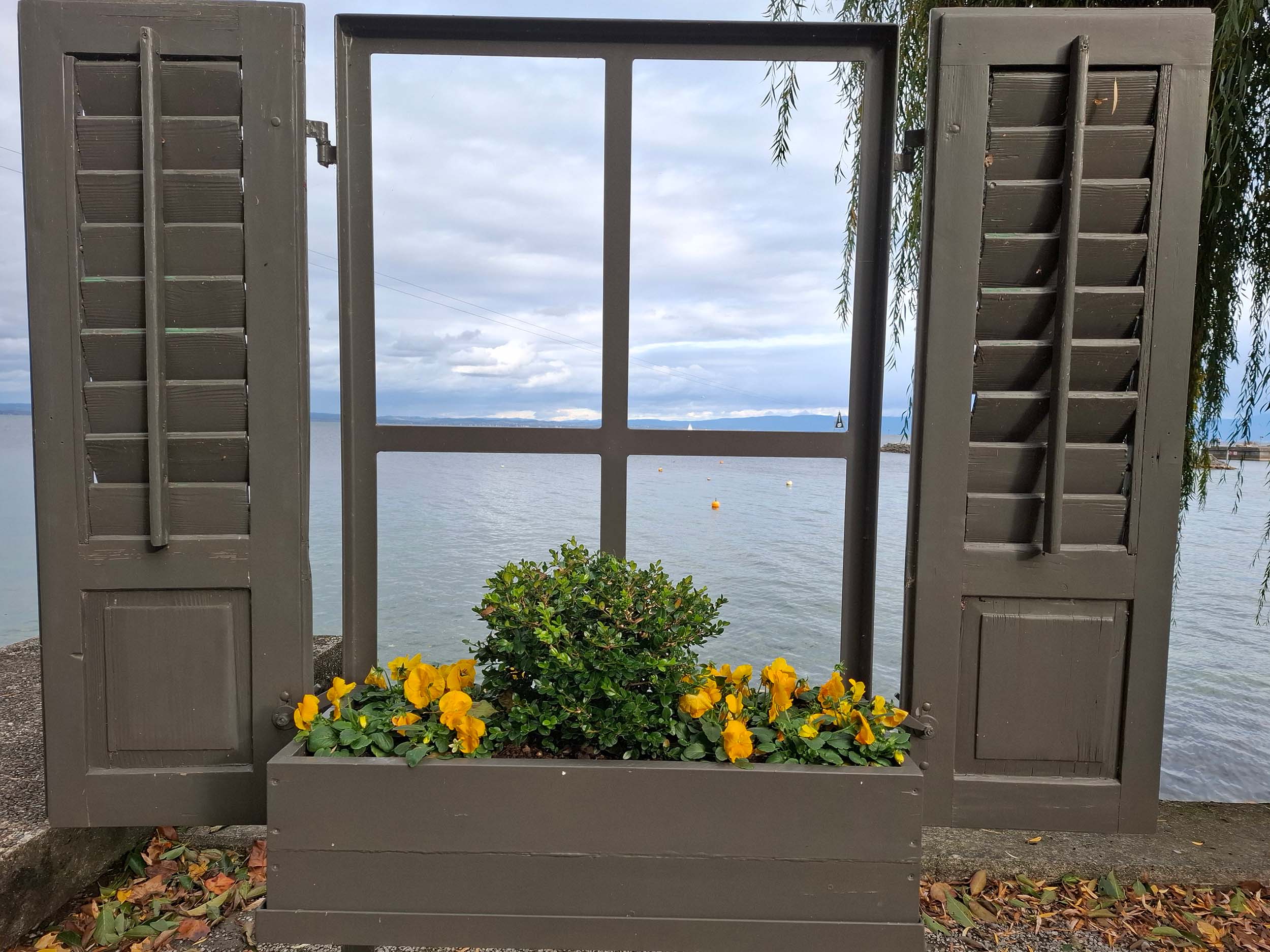 Door dat venster had ik uitzicht op het meer en in de verte op bergen.